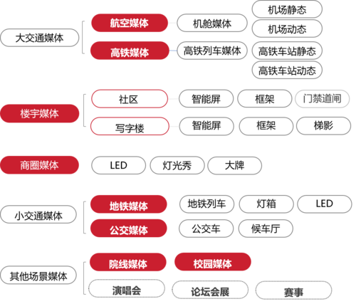 我司拥有覆盖机场、高铁、电梯、商圈大屏、院线、公交、地铁等多个核心场景的超级媒体矩阵,为客户提供实现品牌一站式全案投放,最大化品牌曝光。